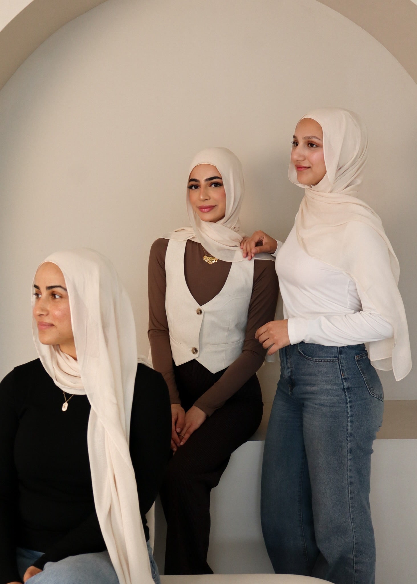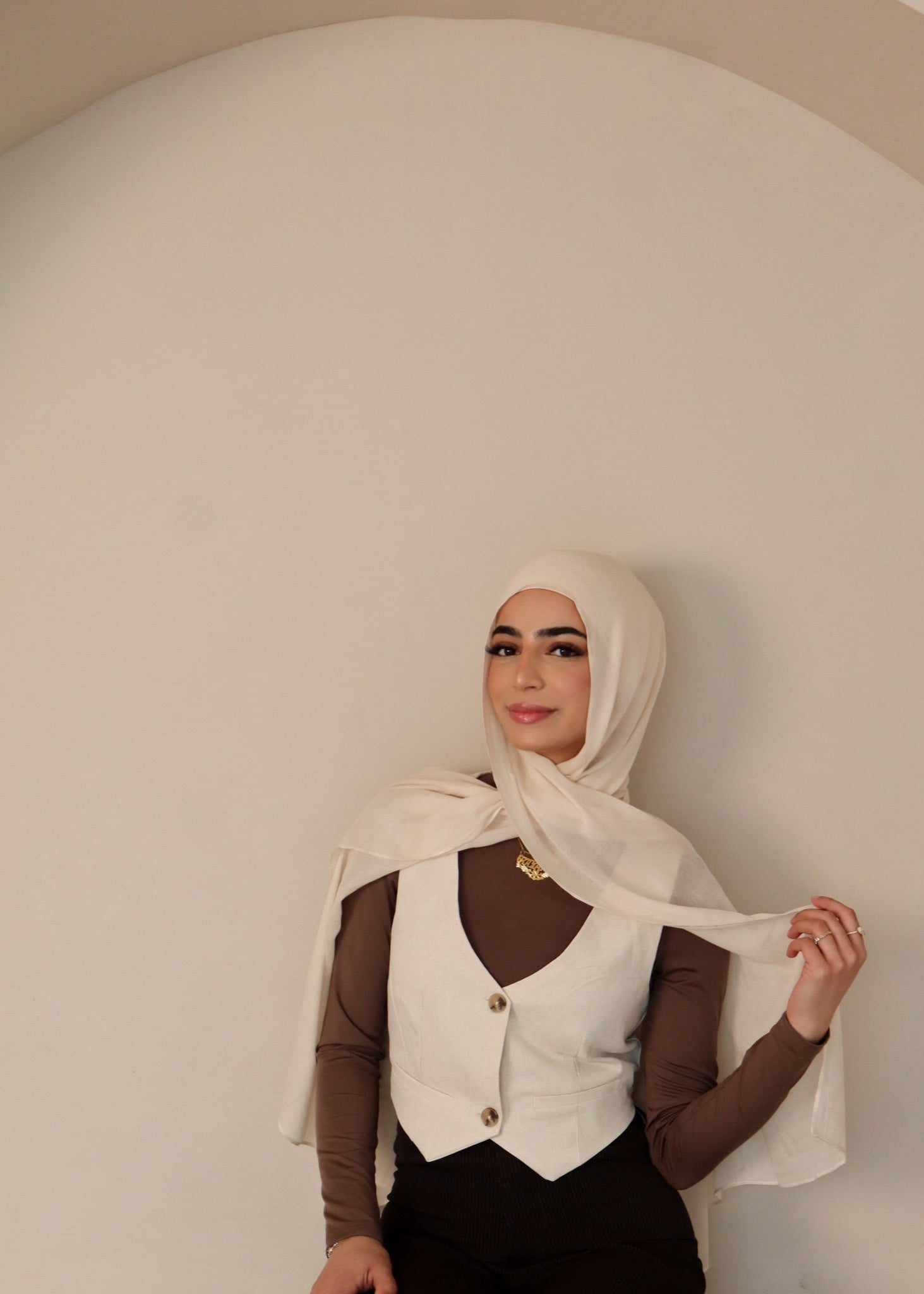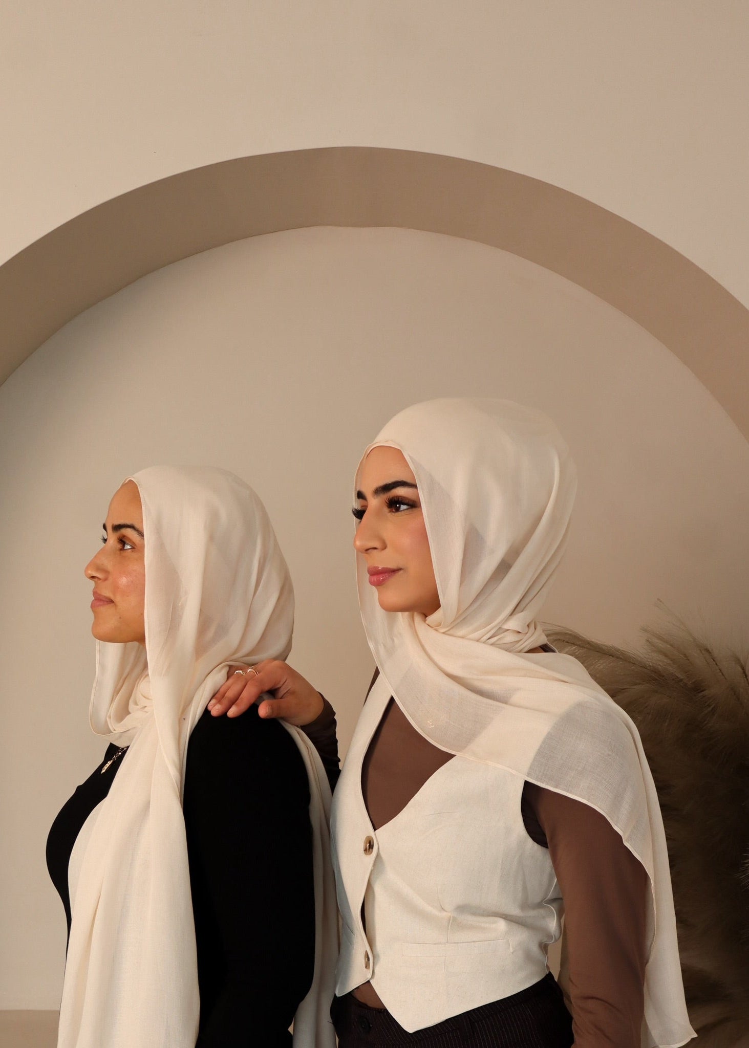 The Asilah hijab is inspired by the coastal charm of Asilah, Morocco, a town known for its whitewashed walls, artistic spirit, and ocean breeze. This soft ivory shade reflects the calm elegance of seaside mornings and the quiet creativity woven into every corner of the city. This simple shade offers a breathable, graceful drape that elevates any look with ease and timeless beauty.